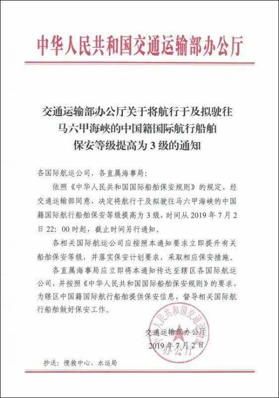 交通运输部办公厅通知各国际航运公司、各直属海事局,依照《中国人民共和国国际船舶保安规则》的规定,经过交通运输部同意,决定将航行于及拟驶往马六甲海峡的中国籍国际航行船舶保安等级提高为3级,时间从2019年7月2日22:00时起,截止时间另行通知。