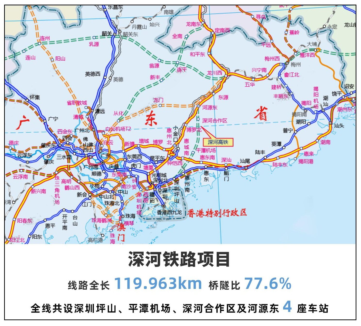 深河铁路位于广东省深圳、 惠州、 河源境内,线路起于深圳坪山站,经惠城南站后接入河源东站。线路全长119.963km,桥隧比77.6%。全线共设深圳坪山、平潭机场、深河合作区及河源东4座车站。