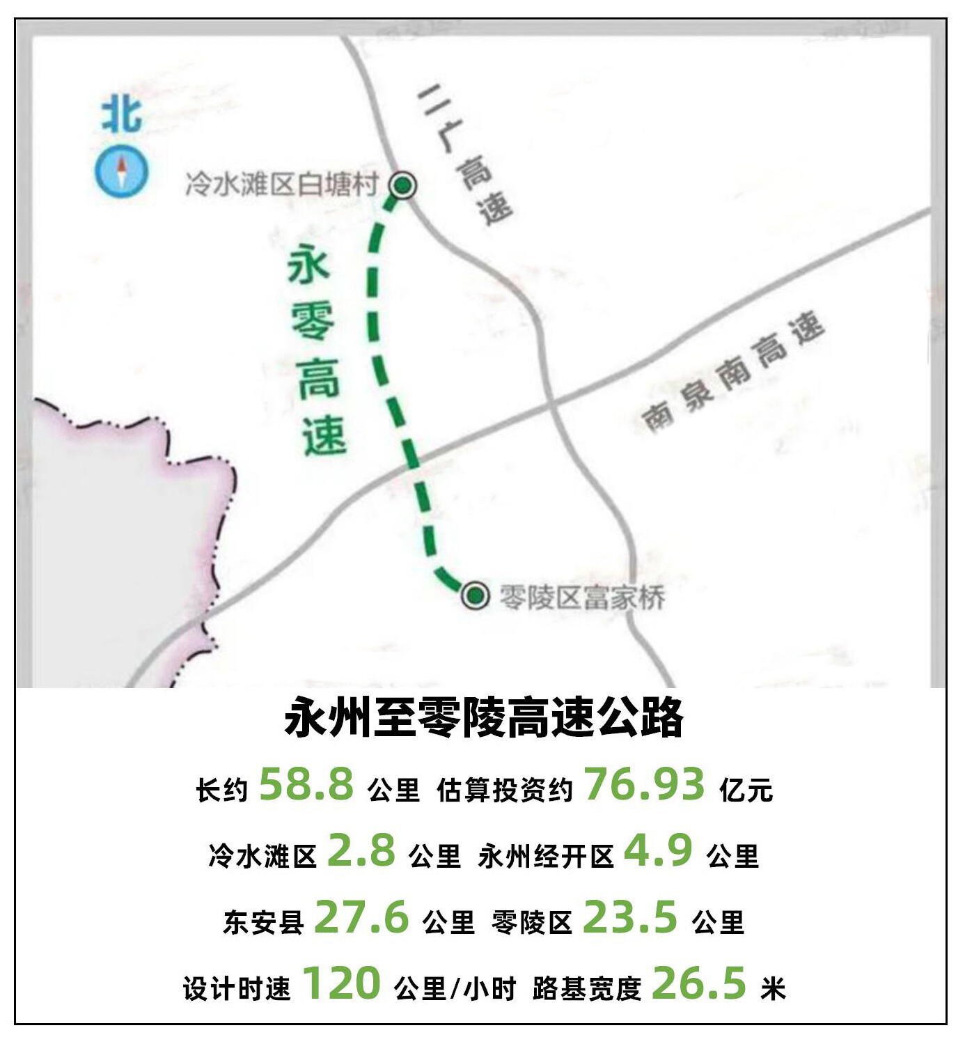 永州至零陵高速公路总长约58.8公里,估算投资约76.93亿元,项目起点位于冷水滩区白塘村,与已建的邵阳至永州高速公路和在建的衡阳至永州高速公路相接,经东安县端桥铺、永州市经开区西、零陵区鸟塘铺,止于零陵区富家桥镇,顺接拟建的零陵至道县高速公路。其中冷水滩区2.8公里,永州经开区4.9公里,东安县27.6公里,零陵区23.5公里。主线采用双向四车道高速公路标准建设,设计时速120公里/小时,路基宽度26.5米。