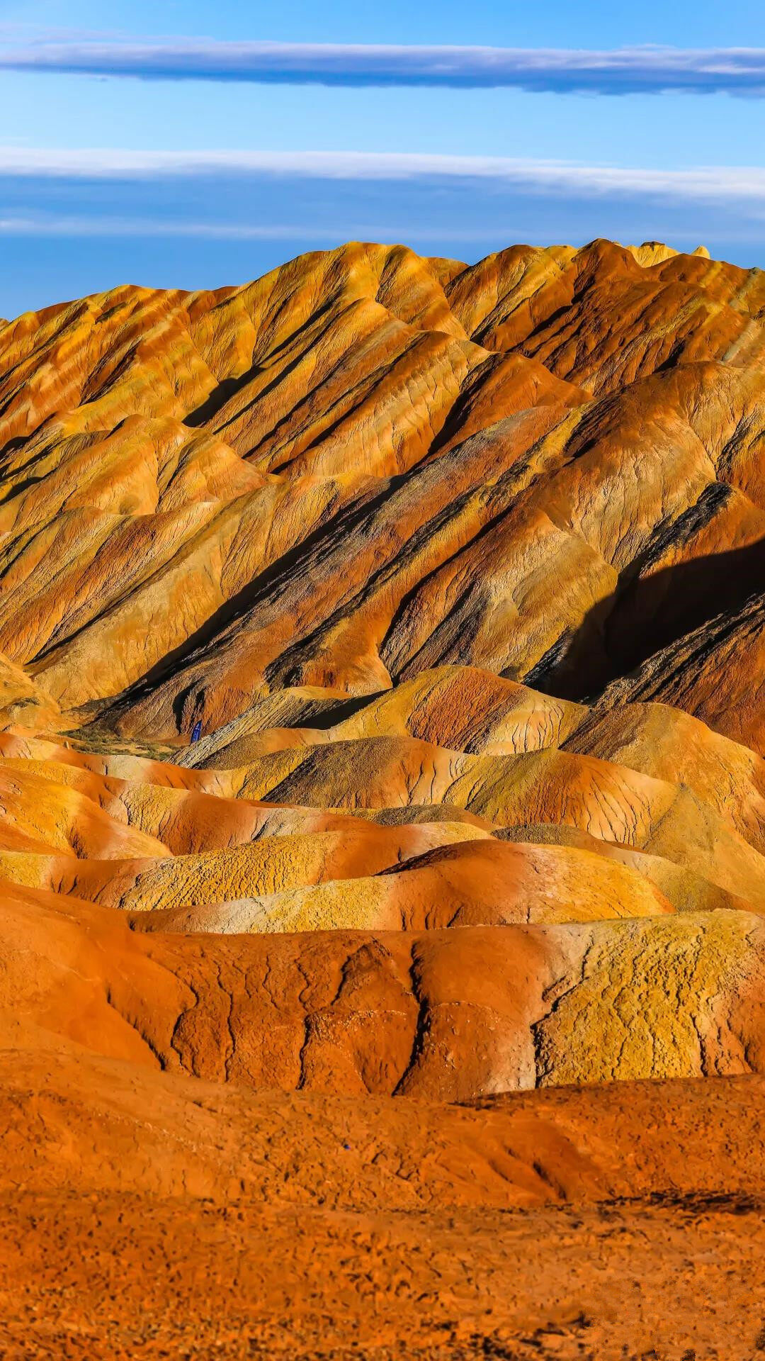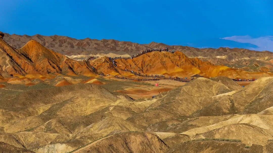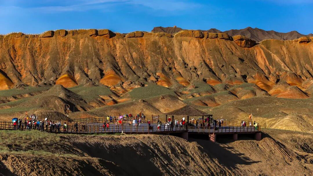 登上观景平台,观看大自然亿万年鬼斧神工雕琢的作品,便会情不自禁地对大自然的神奇力量感到由衷的叹服。层叠的色彩,或如波浪顺着山势起伏,或从山顶倾泻而下,犹如斜铺的彩条布,一圈圈一条条被千年的风层层吹附在山上。