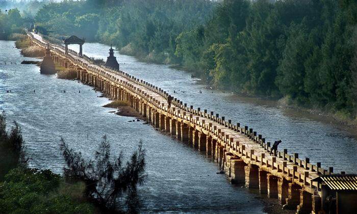 安平桥,位于福建晋江安海镇。桥面由7条大石板铺成,桥头有六角五层砖构宋塔一座,为中国古代最大的梁式石桥,有“天下无桥长此桥”之誉。
