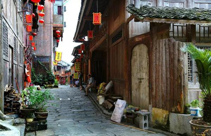 这里还有一条著名的石板街,这条石板街,就是著名国画家吴冠中画笔下的《老街》,吴冠中一走进龚滩,就深深地爱上了这条曲曲折折的石板街,他说龚滩是宋城、是唐街、是爷爷奶奶的家,在这里寄托了他对我们精神文化起源的乡愁。