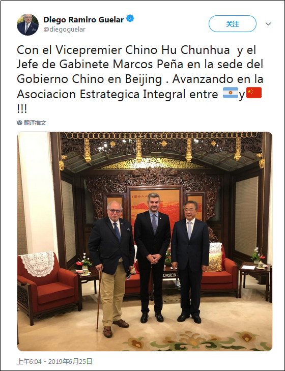 6月25日,国务院副总理胡春华在北京会见了阿根廷内阁首席部长培尼亚一行。在会谈结束后,阿根廷驻华大使盖铁戈(Diego Ramiro Guelar)在社交网站上表示本次会谈“进一步加强了中国和阿根廷之间的整体战略联盟关系”。这是什么?有网友开玩笑说这是赤裸裸的跪舔。