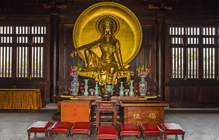 寺院的核心建筑大雄殿气势雄浑、凝重沉稳。殿内正中供奉释迦牟尼佛,两侧侍立迦叶、阿难二位尊者,东奉大智文殊师利菩萨,西奉大行普贤菩萨。五尊圣像庄严无比,均为铜铸贴金(衣服采用金箔,皮肤采用泥金)。