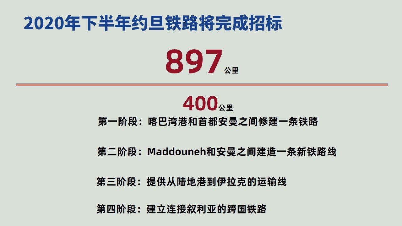 第一阶段,约旦将在喀巴湾港和首都安曼之间修建一条铁路。这条标准轨距线的总长度为400公里,连接亚喀巴港口、集装箱码头、工业区和安曼的Maddouneh干港。第一阶段的可行性研究和详细设计将于2020年下半年完成。土地征用主要集中在安曼、马弗拉克和亚喀巴。今年下半年,招标文件将完成。