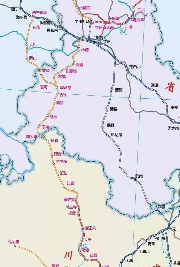 西宁至成都铁路甘肃段位于青海、甘肃、四川三省交界地带,在甘肃省范围主要行走于甘南藏族自治州夏河县、合作市、碌曲县,甘肃境内线路总长183.47km,估算总投资398亿元,其中碌曲县线路长69.65km,夏河县线路长91.85km,合作市线路长21.97km。线路在甘青两省交界处设甘青隧道,出洞后向南经夏河县、合作市、碌曲县分别设甘加、夏河、唐尕昂、合作、碌曲、则岔、郎木寺8个车站。