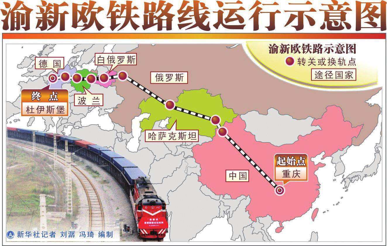 渝新欧从重庆出发,经过甘肃兰州,进入河西走廊,经新疆(或内蒙古)出境,进入哈萨克斯坦、俄罗斯、白俄罗斯、波兰,最后到达德国杜伊斯堡的国际铁路联运大通道,全长约11179公里,途经6个国家,耗时是海运的三分之一,成本是空运的五分之一。