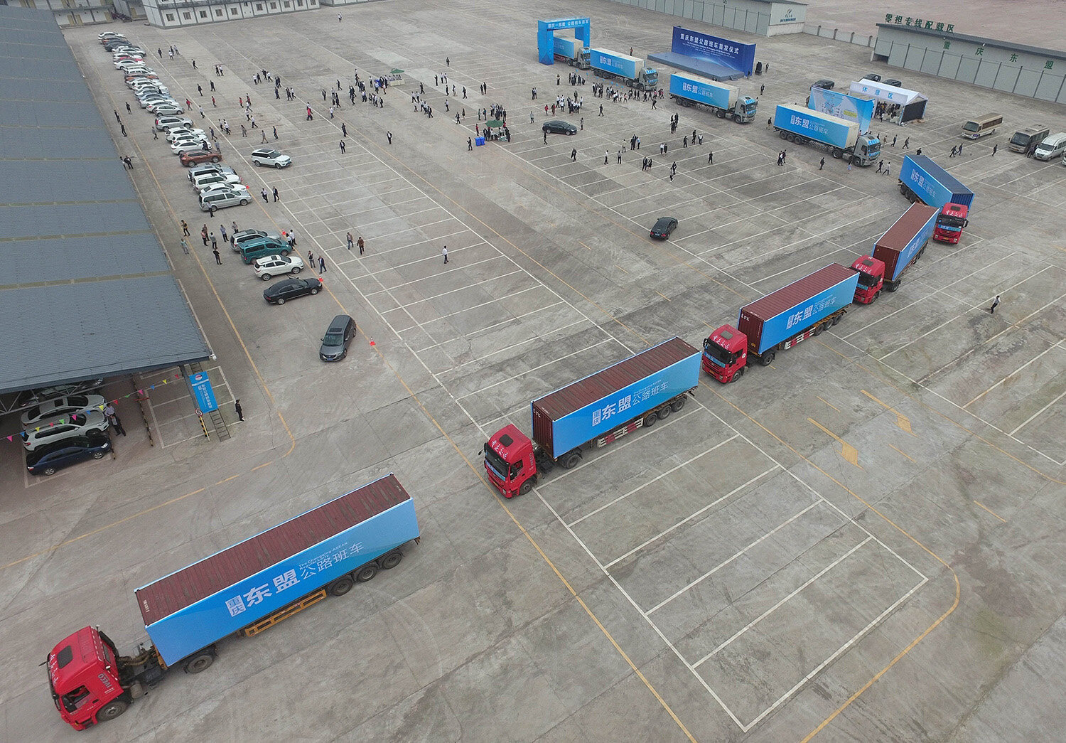 2016年4月28日,10辆满载汽摩配件、电子产品、建材等货物的标准集装箱大卡车从重庆东盟国际物流园内驶出