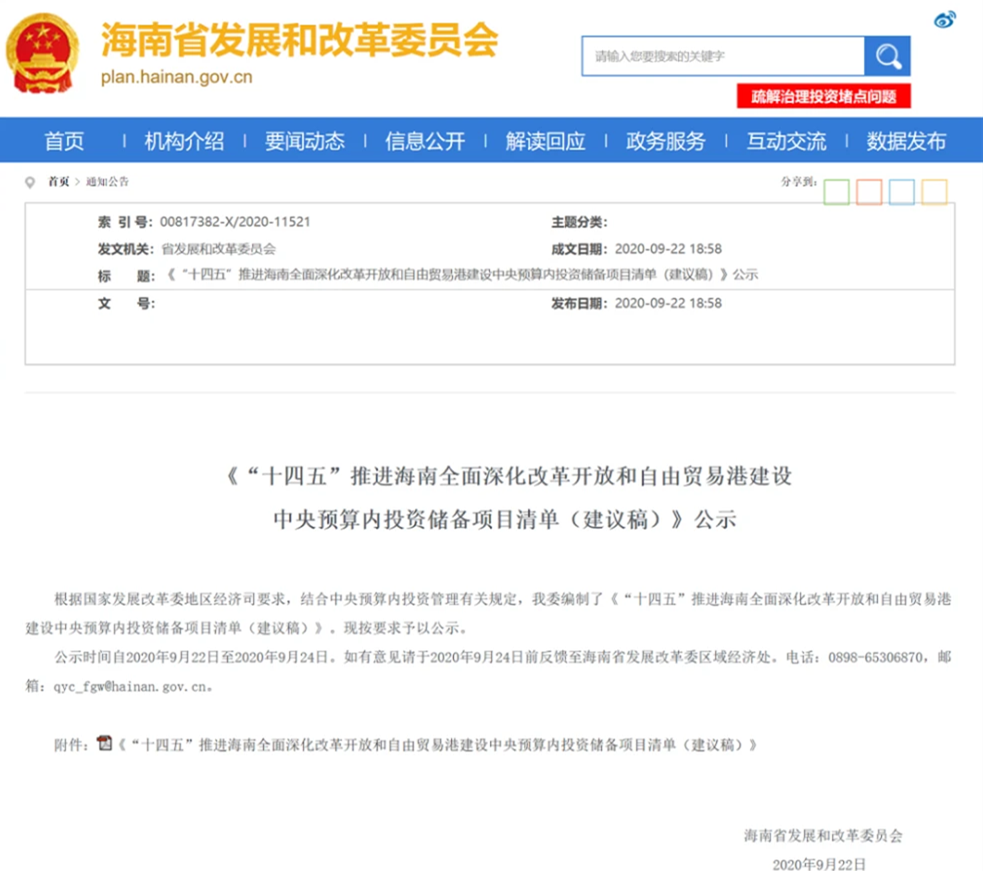 On September 22, the Hainan Development and Reform Commission announced the "Fourteenth Five-Year Plan" to promote the comprehensive deepening of Hainan's reform and opening up and the construction of a free trade port in the Central Budget Investment Reserve Project List (Recommended Draft).