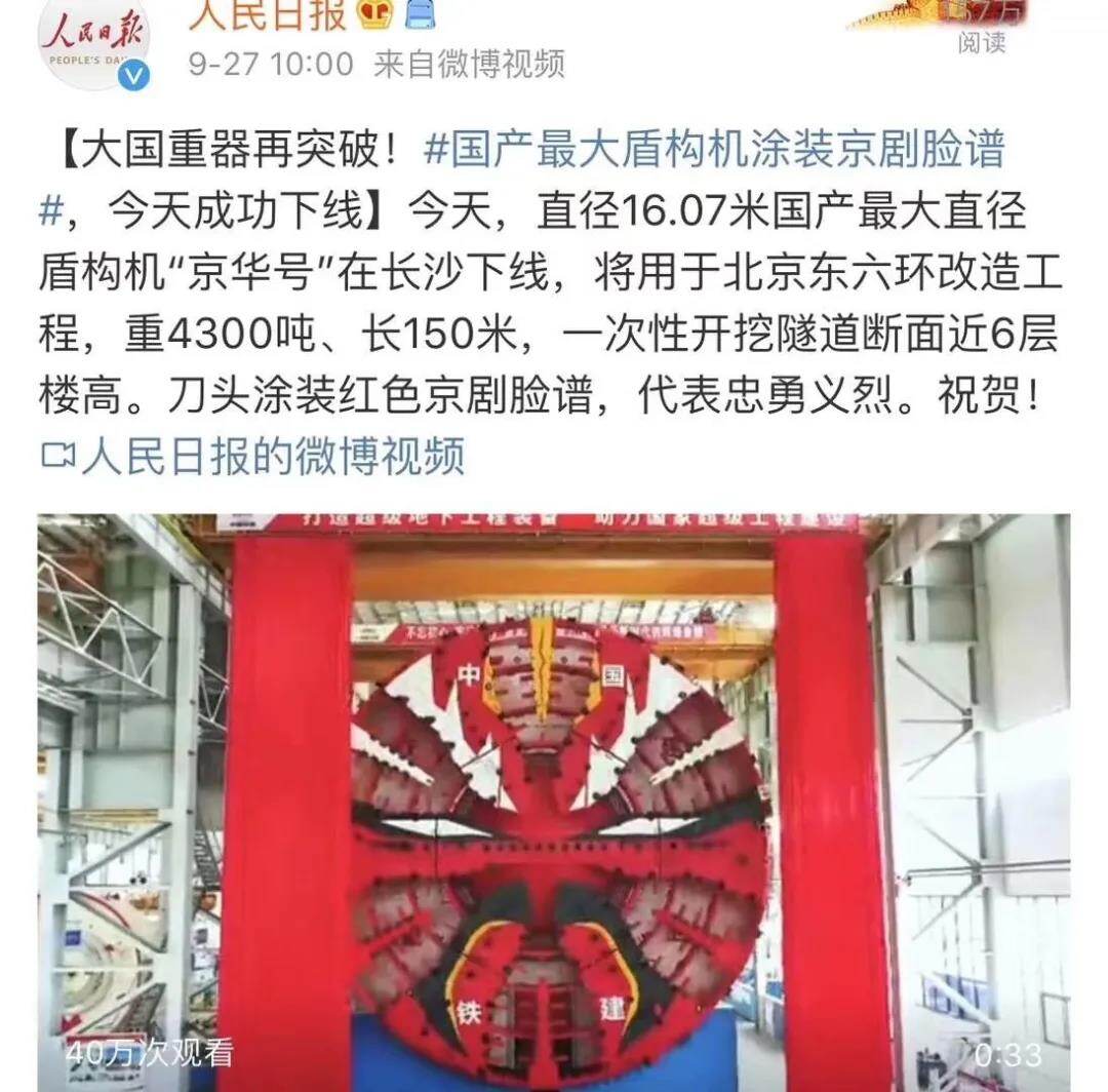 该设备体形巨大,犹如一条钢铁巨龙横卧车间,高度超过5层楼,刀盘涂装从京剧脸谱中提取视觉元素,以京剧中代表忠勇义烈的红色脸谱为设计原型,外观鲜明夺目,凸显北京地域文化特色。