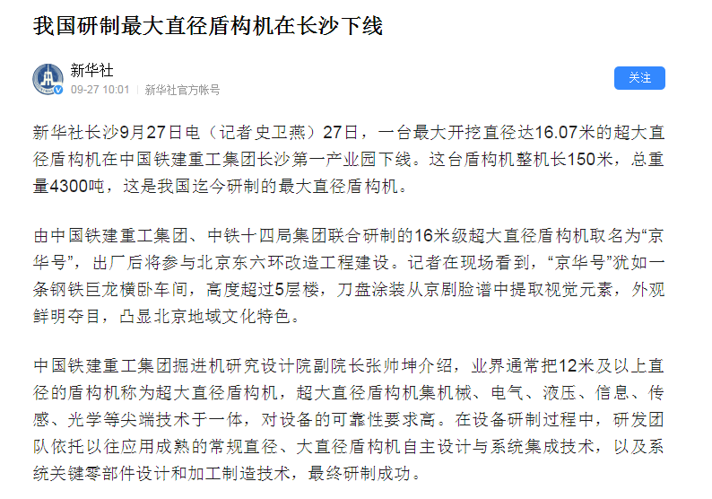 近年来,在国家重点研发项目、工业转型升级专项、省科技重大专项的系列支持下,依托国家级企业技术中心、国家工业设计中心等创新平台,铁建重工在超大直径盾构机领域实现了核心技术自主突破。此次下线的国产最大直径盾构机取名“京华号”,将用于北京市首都公路发展集团有限公司建设管理的北京东六环改造工程,由中国铁建重工集团、中铁十四局集团联合研制,是中国企业首次成功实现16米级超大直径盾构机的工业制造。