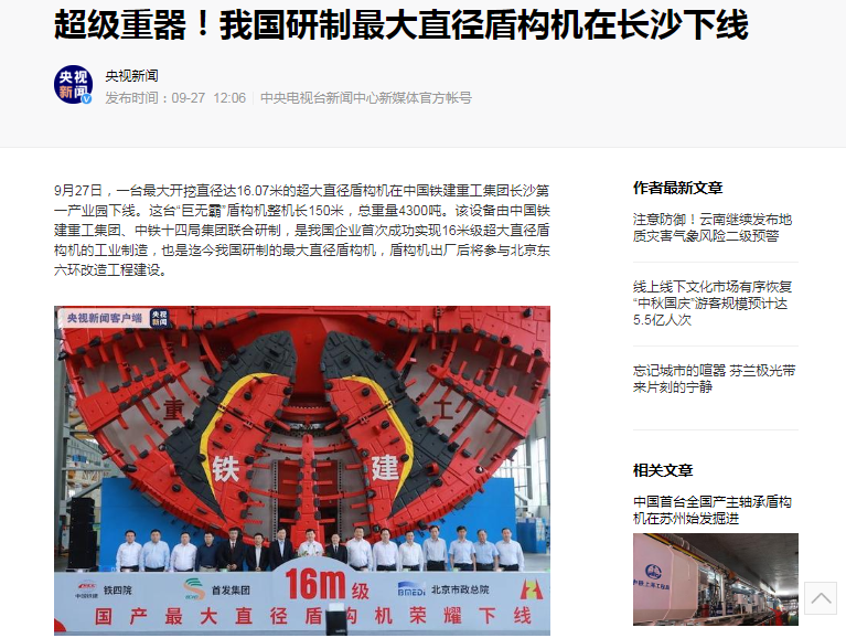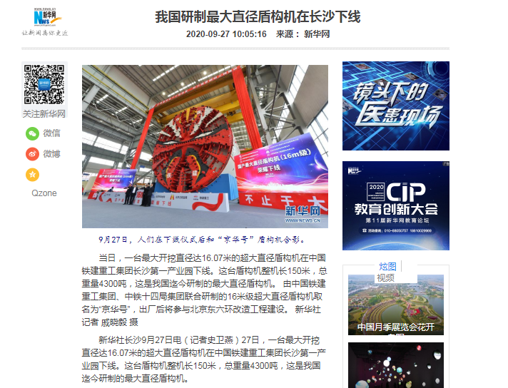 国产最大盾构机成功下线的消息,吸引了人民日报、新华社、中央人民广播电台、中央电视台、经济日报、科技日报、中新社、湖南日报、湖南卫视等数十家中央主流媒体和地方媒体在现场集中采访报道。