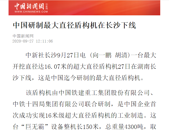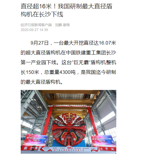 2020年9月27日,一台最大开挖直径达16.07米的超大直径盾构机在中国铁建重工集团长沙第一产业园下线。这台“巨无霸”盾构机整机长150米,总重量4300吨,这是我国迄今研制的最大直径盾构机。