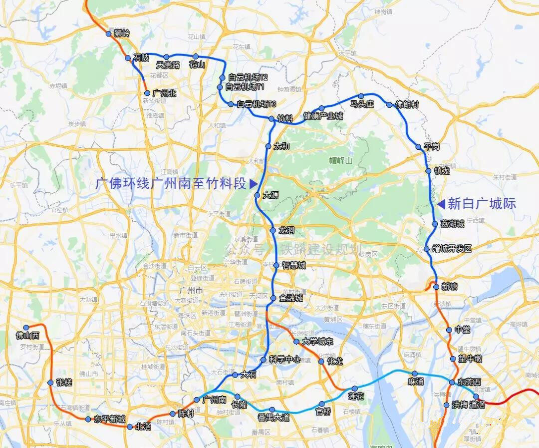 城际铁路方面,正在建设新白广城际(新塘经白云机场至广州北站)和广佛东环城际(途经广州南站、琶洲、金融城),两线在竹料共线引入白云机场,在T3、T1和T2分别设站后,引入广州北站,与在建的广清城际、规划拟建的广佛西环城际衔接,增强白云机场与广佛两市及清远城区的快捷联系。