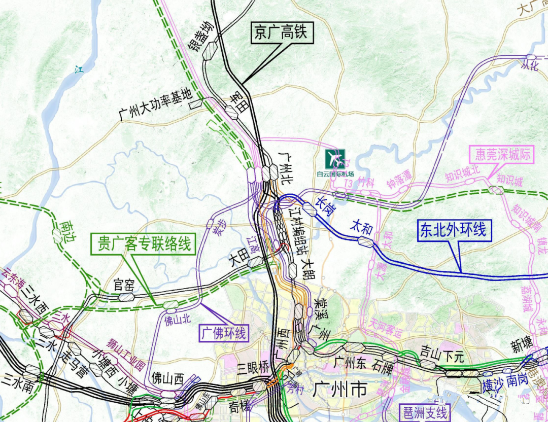 在高铁方面,规划在T3设白云机场高铁站,正线引入两条高铁:广中珠澳高铁、广河高铁,联络线引入四条高铁:广湛高铁、广深第二高铁、广清永高铁、贵广高铁广宁联络线,形成十字交叉的高铁通道。