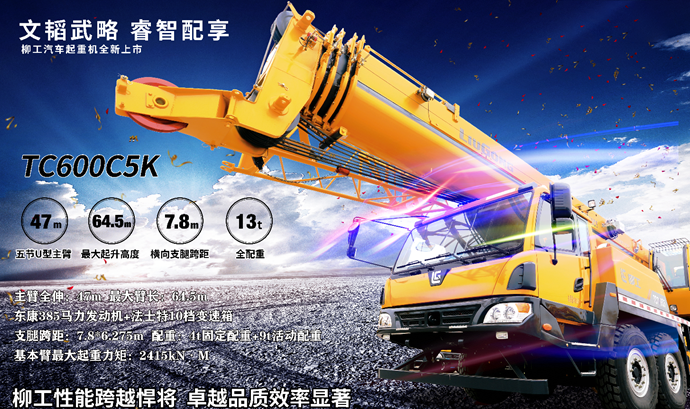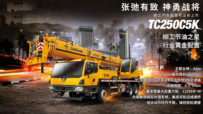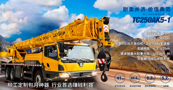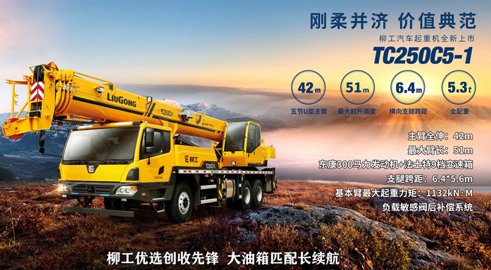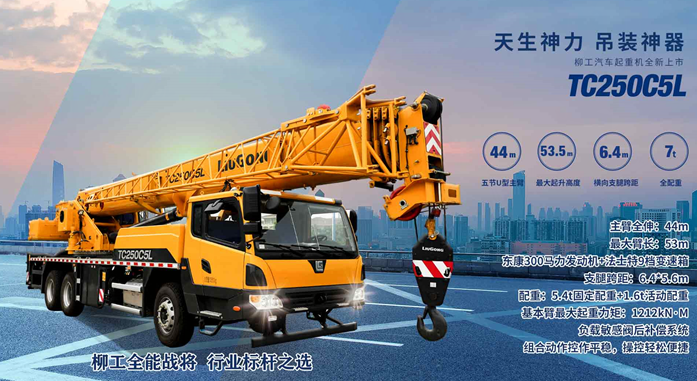 TC250C5L这款是柳工25吨旗舰型产品,基本臂长度11.1米,全伸臂长度44米,搭配9米副臂,最大起重力矩1212kN.m,固定配重+活动配重7吨,中长臂性能全面超越行业25吨。另外,搭载了两种动力系统东康发动机+9档变速箱,节能降耗;上柴发动机+12档变速箱,动力强劲,山区、高原作业适应性更强。