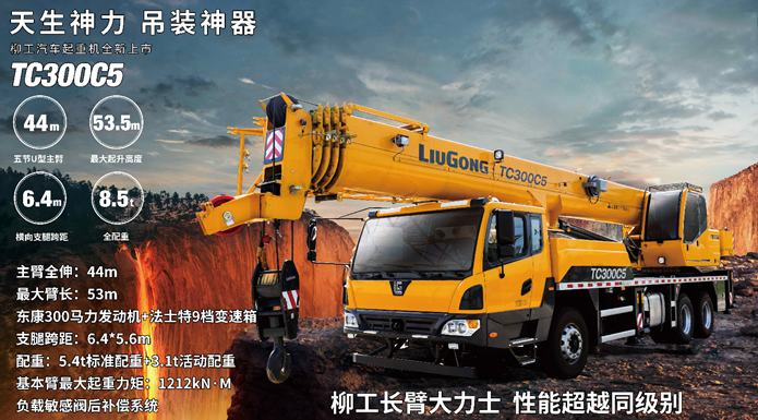 TC300C5 全伸臂长度44米,副臂9米,搭配8.5吨配重,中长臂性能达到行业35吨级产品。