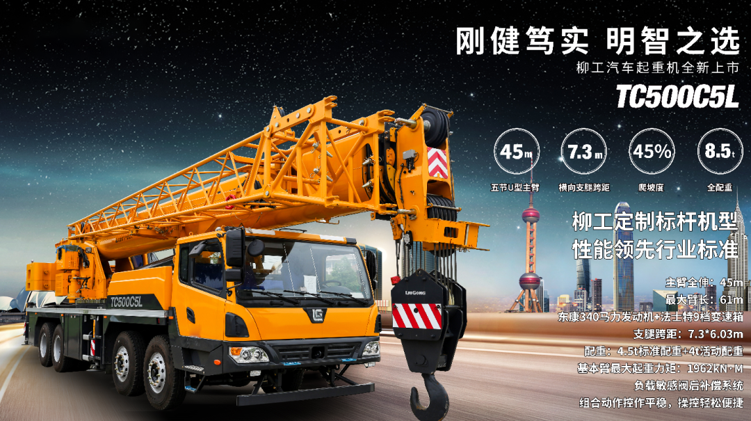 TC500C5是一款50吨级包月之王,性价比非常高;主臂45米,同样也是搭载了2级16米副臂,整机三铰点优化设计,布局更优,双极支腿大跨距,提升整机抗倾翻能力。TC500C5L为柳工50吨级升级版,吊臂材料全面加强,配重加大,整车稳定性更好,性能更强劲。