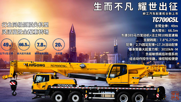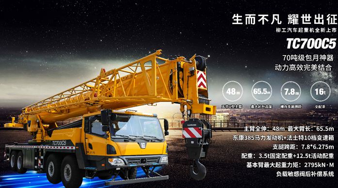 TC700C5L是一款柳工70吨升级版,配重重量、主臂长度、吊臂材质均进行了加强。活动配重20吨、主臂长度49米,起重性能全面提升,达到市场上75/80吨起重机的性能,5种配重组合及5种配重携带方式,性能覆盖40-80吨级,使用灵活,短途转场20吨的配重全部可以随车带走,省钱又省事。