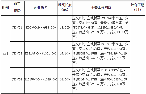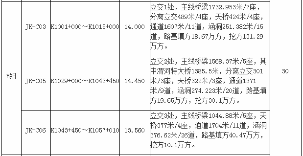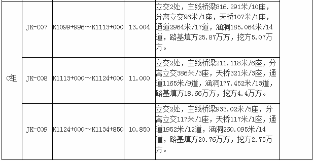 本次招标范围为本项目路基桥涵工程施工,根据工程内容特点划分为9个标段(JK-C01~JK-C09标段),设置3个组别(A组、B组、C组),按组别进行招标。
