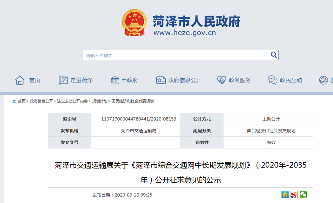 2020年9月29日,菏泽市政府网站发布菏泽市交通运输局关于《菏泽市综合交通网中长期发展规划》(2020年-2035年)公开征求意见的公示,向公众公开征求意见。