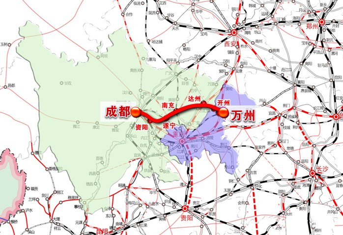 The project is located in the middle-eastern part of Sichuan Province and the northern part of Chongqing. The line starts from Ziyang West Railway Station in the west, passes through Ziyang, Suining, Nanchong, Dazhou, and Wanzhou District of Chongqing City to the east, and ends at the Zhengwan High-speed Railway in Wanzhou North. station. The length of the newly-built main line is 432.386km, which, together with the Zhengwan high-speed rail, the Yichang-Zhengwan high-speed rail link and other lines, constitutes a high-speed railway passage along the Yangtze River. It is an important part of the high-standard passenger transportation passage in the Sichuan-Chongqing area.