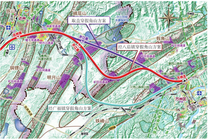 According to the preliminary design plan, the line leads from Wanzhou North Station to the west along the Yuwan Intercity, crosses the Yuwan Intercity, crosses Tiefeng Mountain and then turns to the north, and crosses the provincial highway S303 and Puli River on the north side of Yuexi Town. Walk along the east wing of the false corner, pass through the Chengmendong coal mine and then cross the false corner mountain, to the northwest to Mingyue Mountain, and set up the Kaijiang South Station in Luojiapo Village.