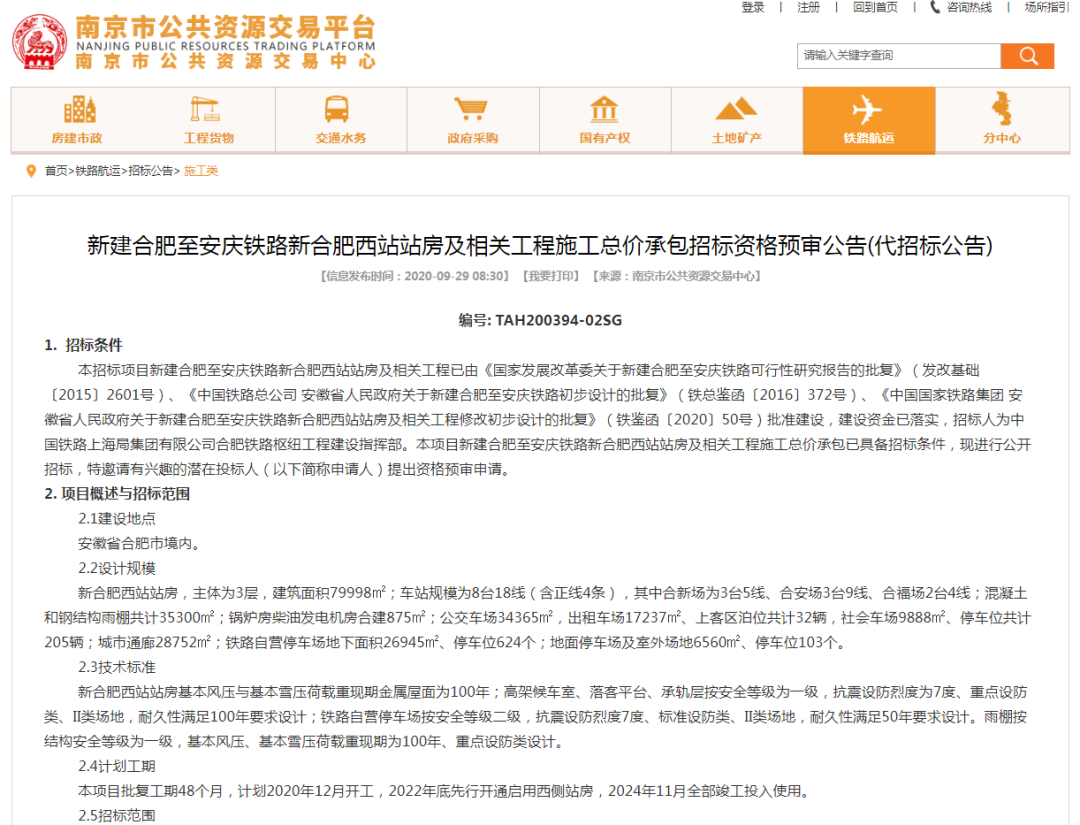 2020年9月29日,《新建合肥至安庆铁路新合肥西站站房及相关工程施工总价承包招标资格预审公告》在南京市公共资源交易中心正式发布。据了解,新合肥西站建设总工期4年,计划2020年12月开工,2022年底先行开通启用西侧站房,2024年11月全部竣工投入使用,总投资96.4亿元。