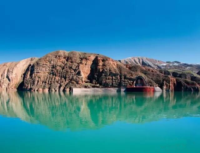 The clear water of the Huangyang River is like a mirror, and the majestic shore of Tianti Mountain is reflected in the clear blue waves. The big Buddha in the grotto sits against the mountain, with blue waves rippling at its feet, and thin clouds entwining its body, forming a magnificent scene of mountains, water, Buddha, and clouds. From the reservoir, after passing the reservoir by boat, follow the plank road and climb to Tianti Mountain. Overlooking, the daisy-green Qilian Mountains come into view, with ridges and mountains. The top of the mountain is white, making the cyan mountain look even colder. The lake water is set against the blue sky, white clouds, and green mountains, like a warm jasper, adding a touch of beauty to this originally desolate world.