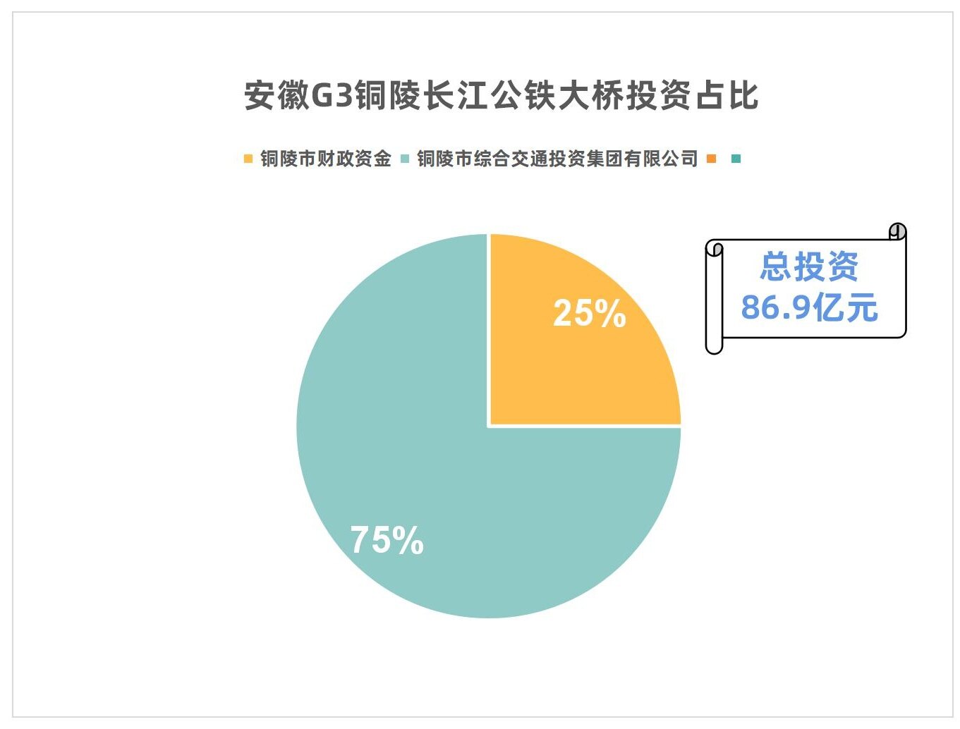 该项目建设工期4年,估算总投资86.9亿元。项目资本金占总投资25%,由铜陵市安排财政资金出资,其余75%由项目法人铜陵市综合交通投资集团有限公司通过银行贷款等渠道解决。