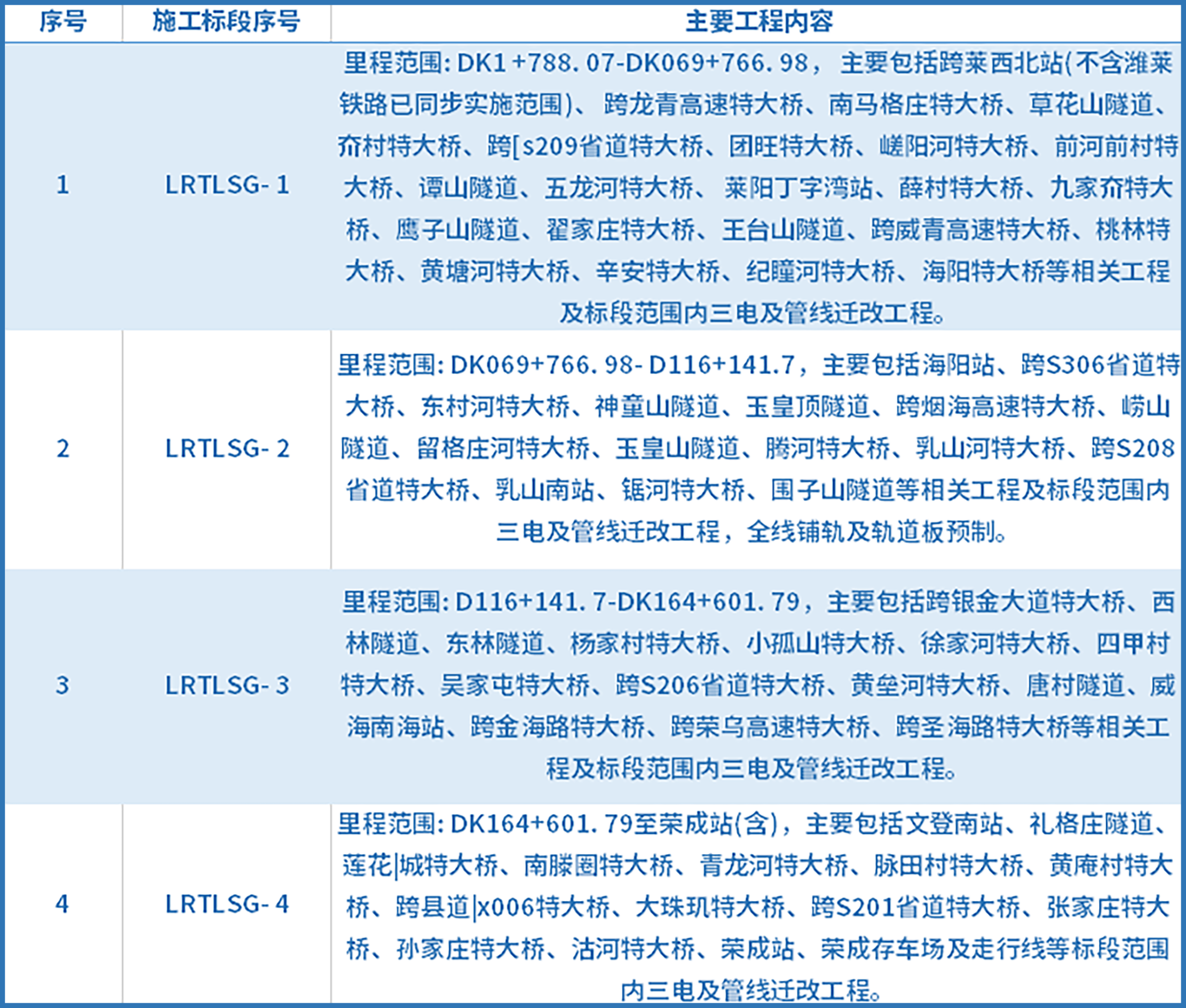 2020年10月26日,见道网从济青高速铁路有限公司了解到,新建莱西至荣成铁路站前工程开标,分为4个标段。