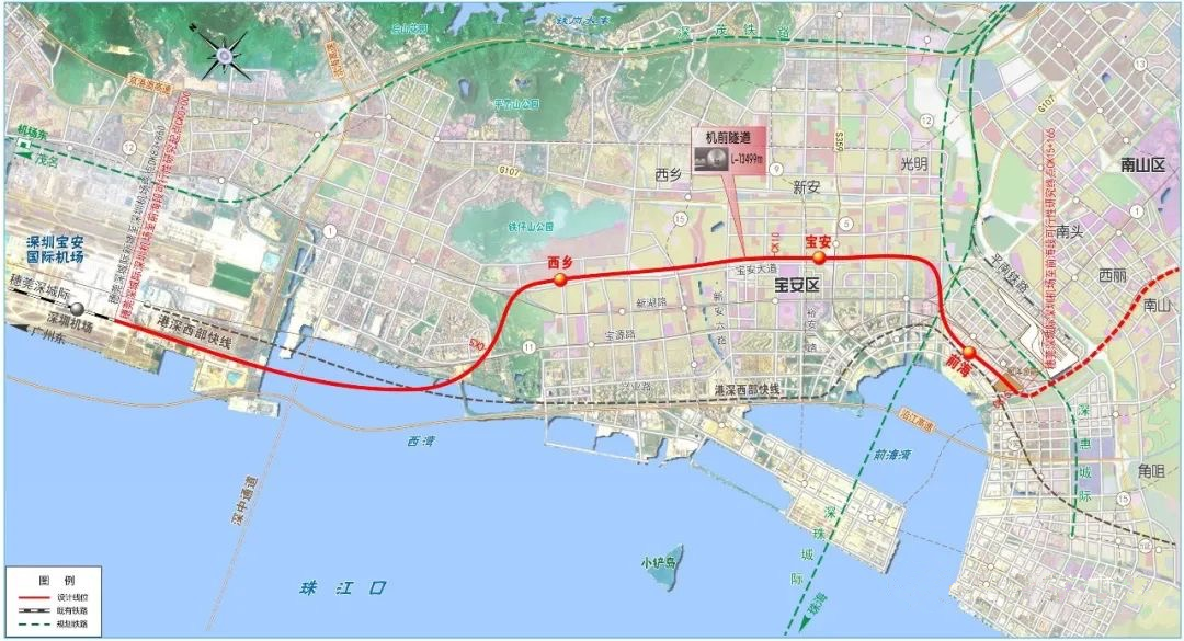 其中,机场至前海段是深圳首条自主投资建设的城际铁路,目前已进入主体结构施工阶段。线路经宝安区航城、西乡、新安街道至前海综合交通枢纽,全长约15.2公里,全线地下敷设,共设3座车站西乡、宝安、前海。该工程项目设计速度为160公里/小时,采用8辆编组的CRH6型动车组,计划2025年建成开通。