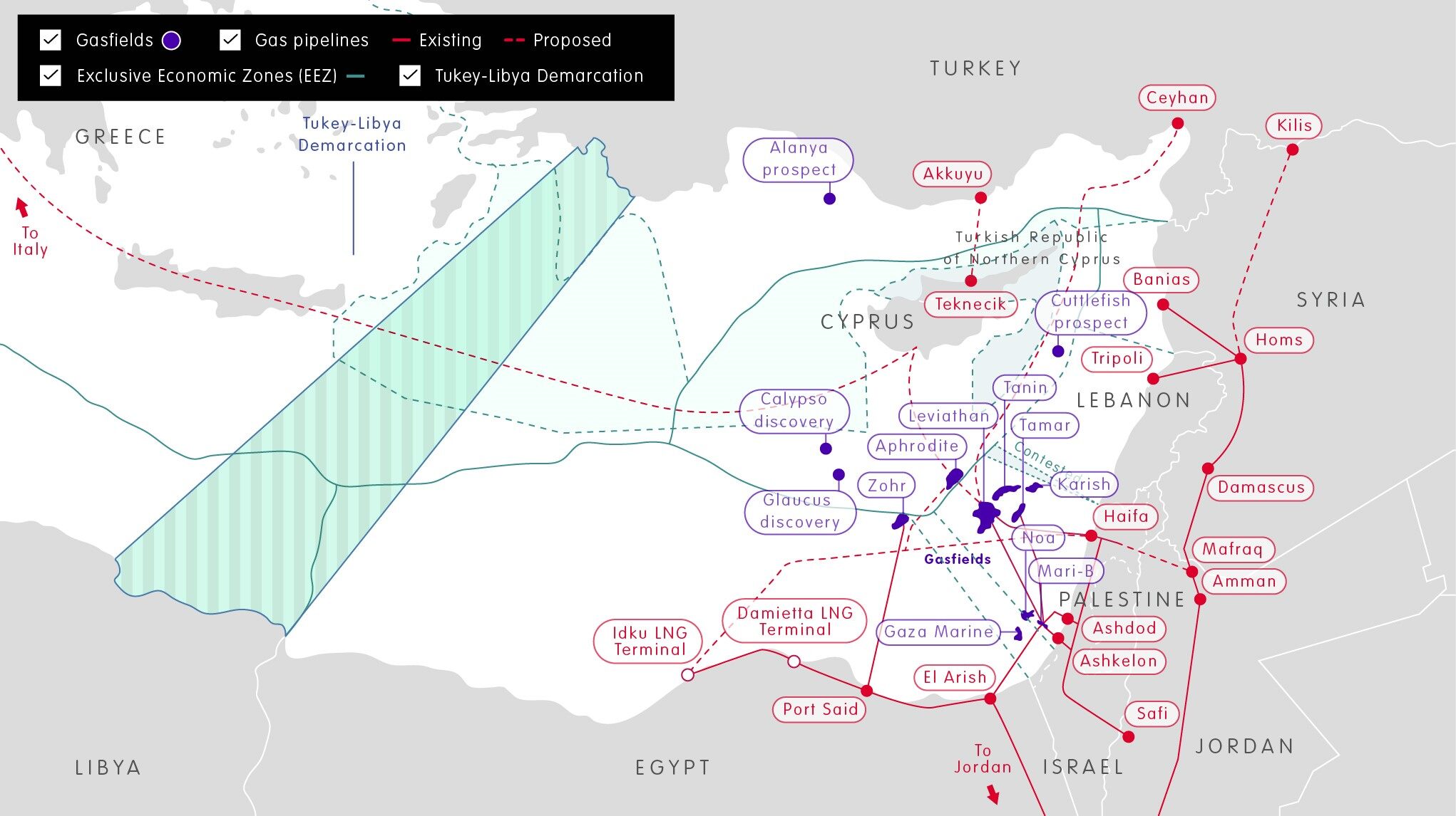 埃及有很多油田,包括2015年发现的超级Zohr油田。以色列有Leviathan和Tamar油田已经在生产。因此,以色列和埃及之间存在着明显的天然气联系两国进行天然气贸易,并合作将天然气再出口而地中海东部的其他地区则处于停滞状态。