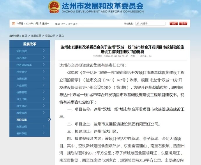 On November 2, 2020, the Dazhou City Development and Reform Commission issued the "Approval of the Proposal for the Municipal Infrastructure Construction Project of the Comprehensive Development Project of the "Two Cities and One Tier" City in Dazhou".