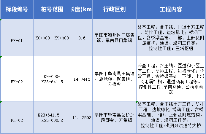 阜阳至淮滨高速公路安徽段路基工程(含路基、桥涵工程),包含施工、交验、缺陷期修复等工作内容,划分为3个施工标段,标段划分如下: