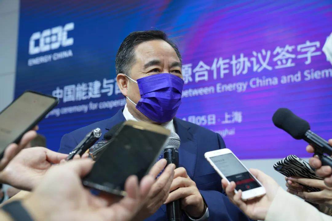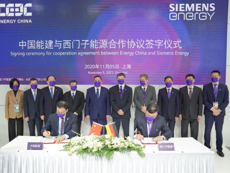 2020年11月5日上午,中国能建所属葛洲坝国际公司与西门子能源公司在进博会展厅现场举行采购协议签约仪式,中国能建党委书记、董事长宋海良和西门子能源全球高级副总裁姚振国见证签约。按照协议,中国能建将采购燃气联合循环电站等一批项目的燃气轮机和汽轮发电机。