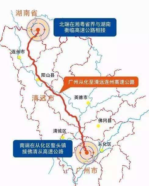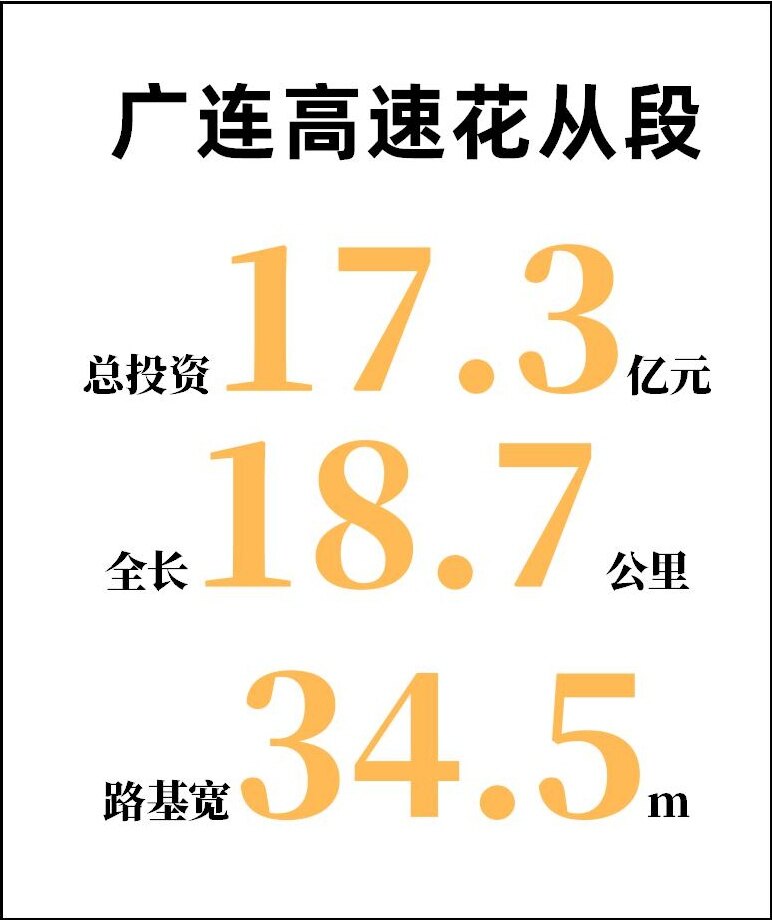 广连高速公路花从段起于广州市花都区花东镇竹湖村,接广州新白云国际机场第二高速公路,终于广州市从化区鳌头镇五丰村,接广州从化至清远连州高速公路。路线全长18.7公里,采用六车道高速公路标准,路基宽34.5m。全线共设桥梁19座,隧道5座,桥隧占比为79%;全线共设互通式立交3处,力争2022年底建成通车。广连高速公路花从段是广东省高速公路网规划的重要组成部分,也是广州市的重要北出口公路和新白云国际机场的重要集散通道。它的建设,对完善省高速公路网规划,打通规划广州至连州高速公路断头路,增加广州市北出口公路通道,服务广州建设国际商贸中心和综合交通枢纽,构建平行于京港澳国家高速的南北交通新动脉,疏解广乐高速、京港澳高速以及珠三角环线等的交通压力具有重要作用;对增强空港经济圈向北辐射能力,促进广清一体化,拉动粤北地区经济,实现粤北地区和珠三角地区优势互补、共同发展、支撑粤港澳大湾区发展具有重要意义。