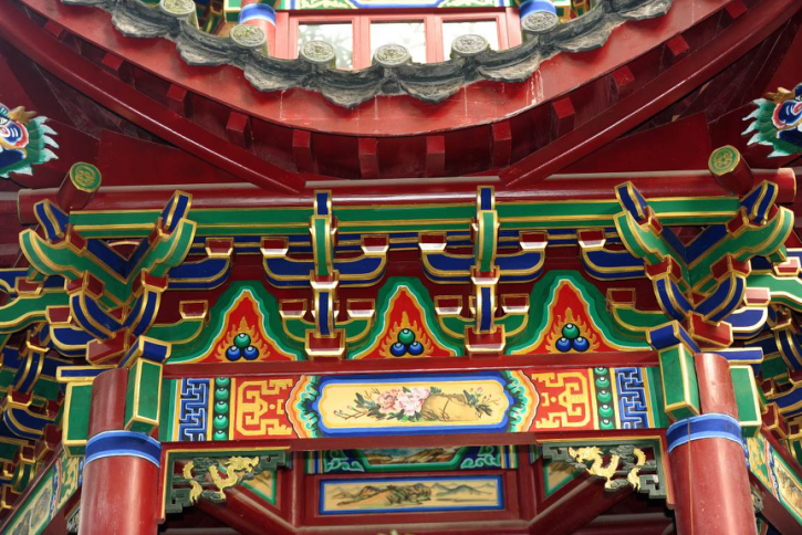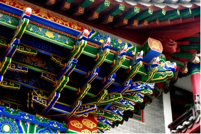 但是在古镇我们能看见这样的斗拱,用古建筑斗拱结构形式,在钢筋混凝土梁板上通过现代技术手段,用纵横相叠的短木和斗形方木(斗、拱、昂、升、翘)相叠而成向外挑悬的斗拱,斗拱上画有色彩斑斓的彩绘,用现代技术展示出古代斗拱艺术的独特魅力。