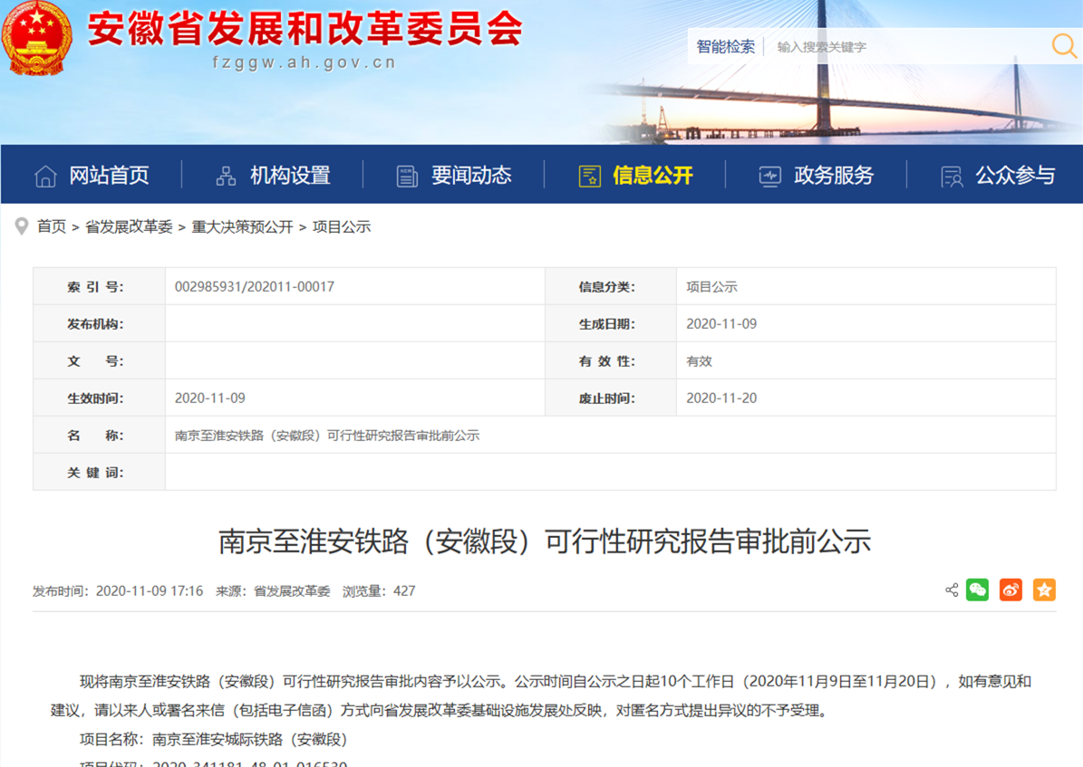 On November 9, 2020, the Anhui Provincial Development and Reform Commission issued the "Nanjing-Huai'an Railway (Anhui Section) Feasibility Study Report Before Approval Publicity", the publicity period will be until November 20, which marks the Ninghuai High-speed Railway Anhui Section Feasibility Study Report Approved soon, the project is expected to start construction before the end of 2020.