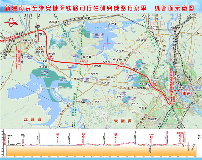 The Nanjing-Huai'an Intercity Railway (Anhui Section) starts from the border of Jiangsu and Anhui on the south side of Jinhu Station, passes through Tongcheng Town, Yangcun Town, Tianchang City and Zhengji Town to the south to the provincial border of Anhui and Jiangsu. The total length is 43.9 kilometers, all of which are overhead lines, and the new Tianchang Station (2 sets of 6 lines, and the planned introduction of the Chutianyang Intercity Railway is reserved). Adopting the technical standards of double-track high-speed railway, the designed driving speed is 350 km/h, the construction period is four years, and the total investment is 8.48 billion yuan.