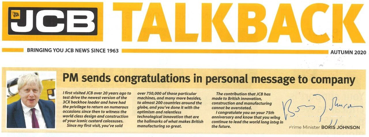 JCB于1945年成立,2020年10月23日,是JCB成立75周年纪念日。英国首相鲍里斯·约翰逊致信祝贺JCB成立75周年。英国首相鲍里斯·约翰逊贺信摘录如下: