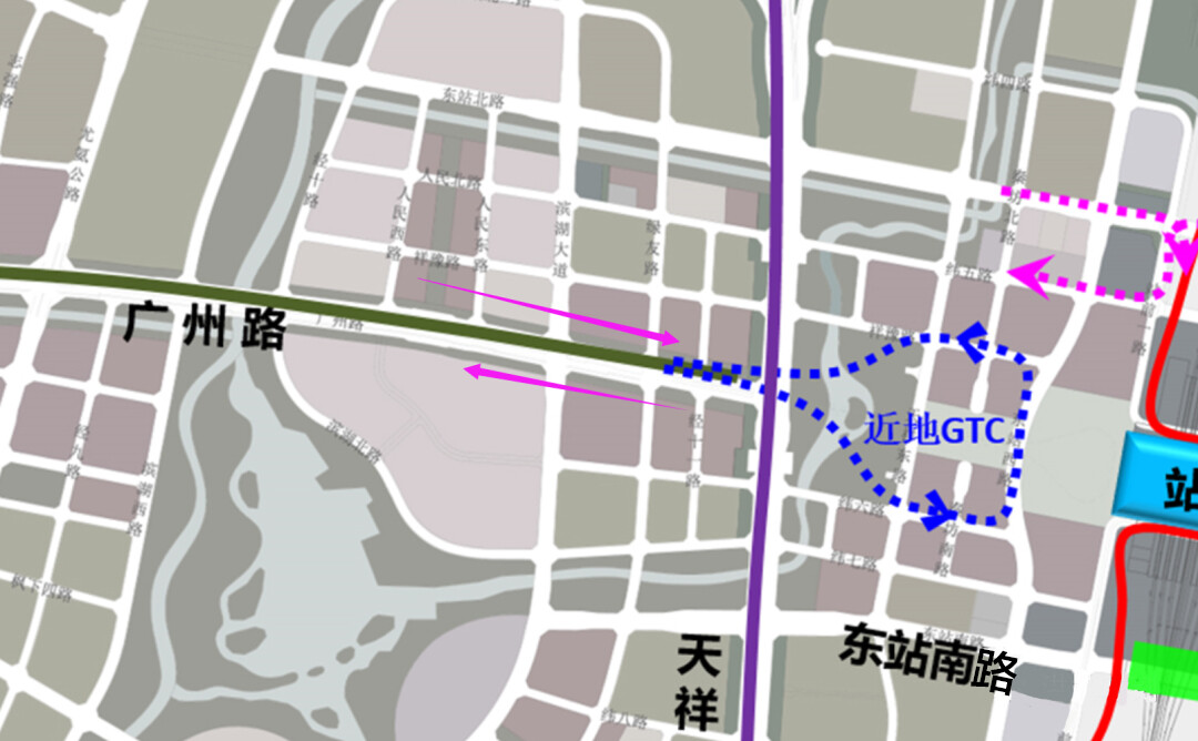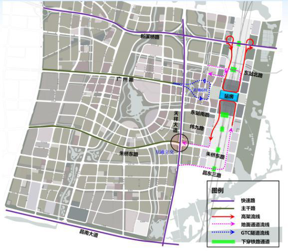 东站GTC隧道规划在西广场,并且衔接广州路,整体实现对外高效联系,确保车站与城市交通,过境交通的相对分离,互不干扰。