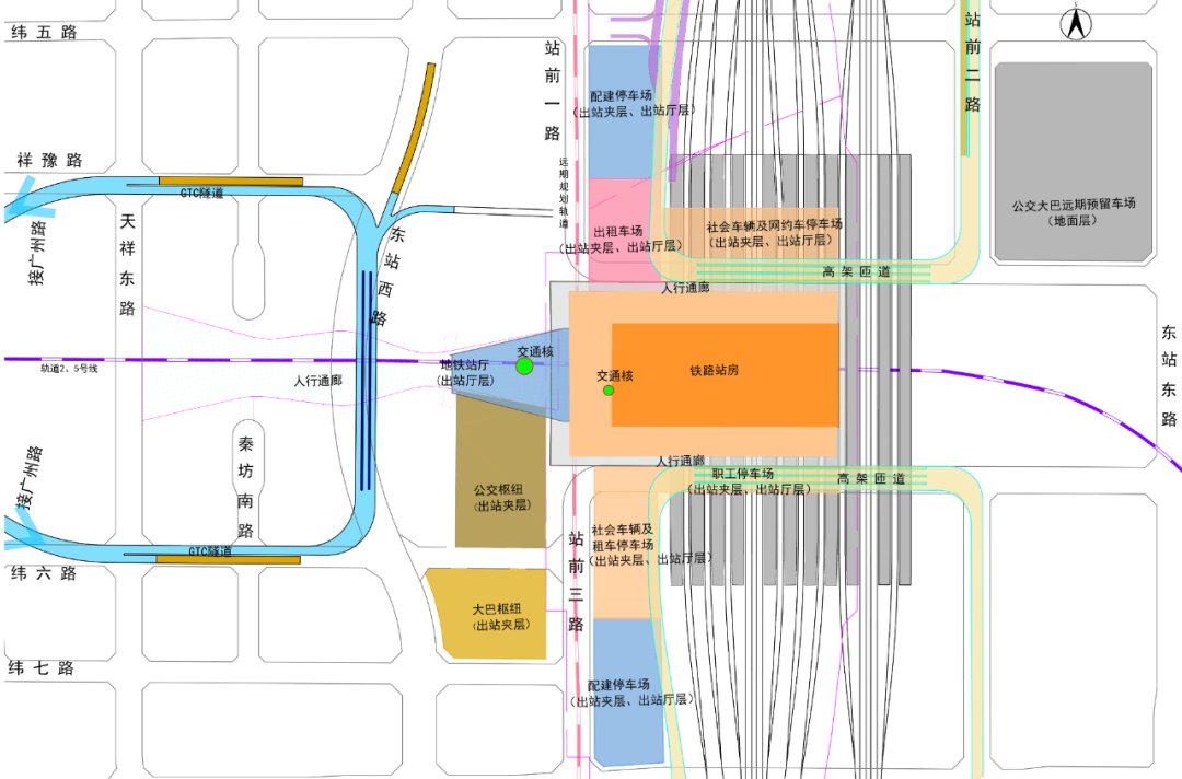 东站南北规划有腰部进站高架匝道,并设置进站车行送客平台,与枢纽两侧衔接,旅客可快速进入高铁候车厅,GTC隧道与高铁站下空间合建,连接地下交通设施,设置落客通道实现旅客的快速换乘。