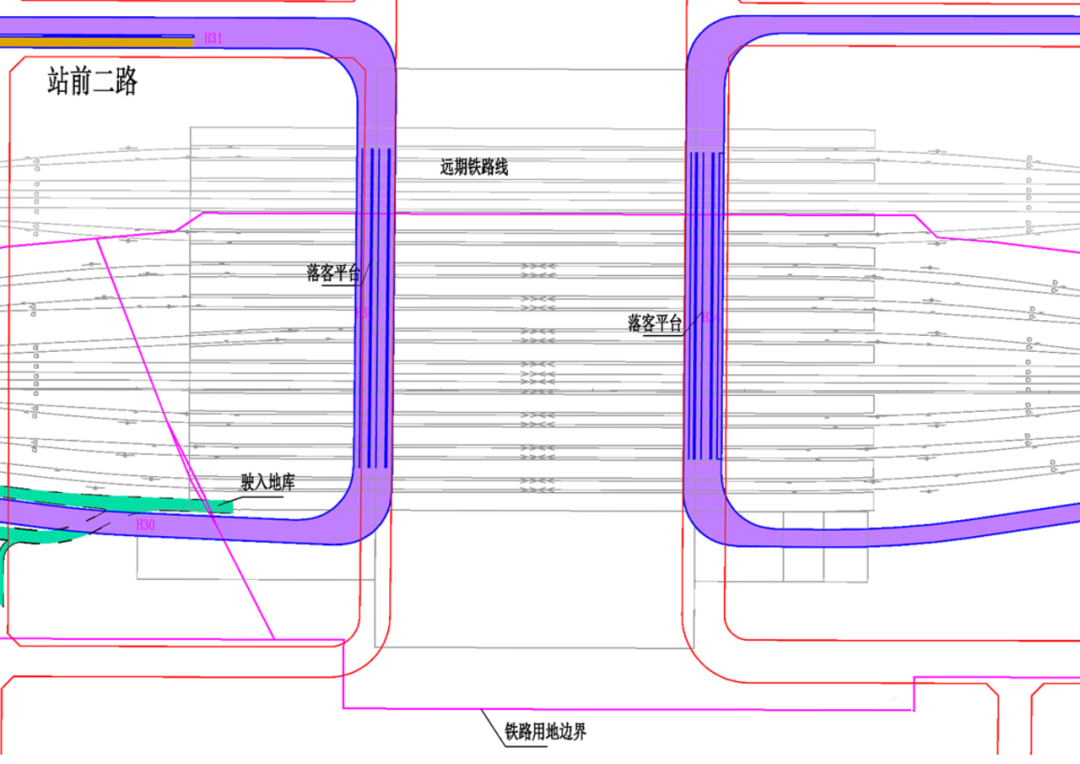 从东站铁路线看,分为远期和近期,其中近期共有9台16线,为了考虑后续的东扩,比之前8台16线多了一个站台,远期预留站台2座和到发线3条。