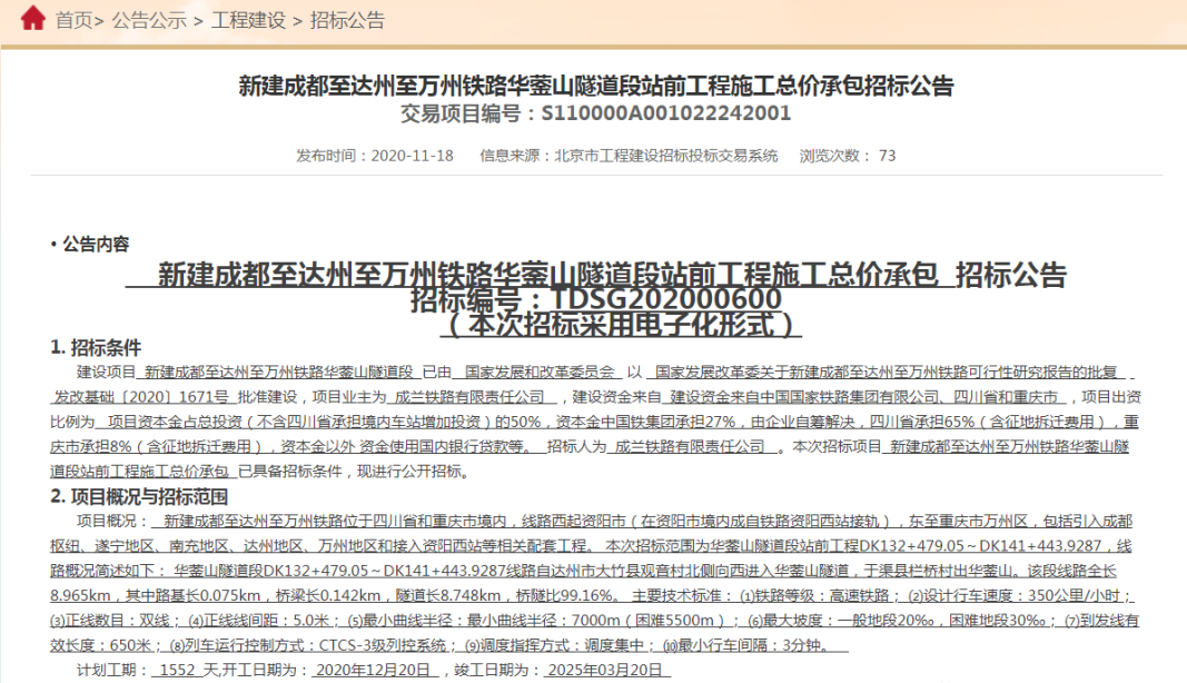 2020年11月18日,《新建成都至达州至万州铁路华蓥山隧道段站前工程施工总价承包招标公告》在北京市公共资源交易中心正式发布。据了解,华蓥山隧道作为本次先期开工段控制性工程,全长8748米,位于渠县和大竹县境内,渠县北站至达州南站区间。根据招标公告,该项目计划12月20日开工建设,2025年3月竣工。