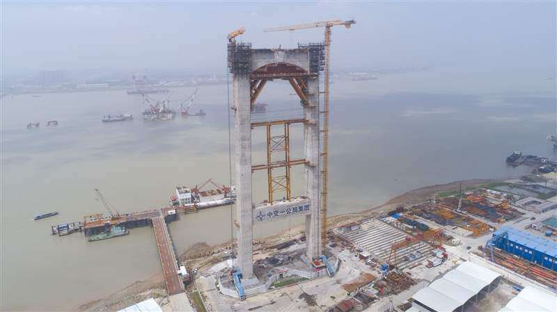 The middle tower is A-shaped longitudinally and gate-shaped laterally. The height of the tower column is 139 meters, which is divided into 25 sections for pouring. During the construction process, the builders actively innovated and used BIM technology to simulate the whole construction process, combined with the self-developed hydraulic climbing formwork system and intelligent real-time monitoring system, to overcome the influence of unfavorable factors such as strong tide, typhoon, and high temperature. The construction time was shortened from 8 to 9 days to 6 days. After more than a year of overcoming difficulties, the interim goal of capping the middle tower was achieved ahead of schedule, providing a strong guarantee for the subsequent cable erection of the bridge.