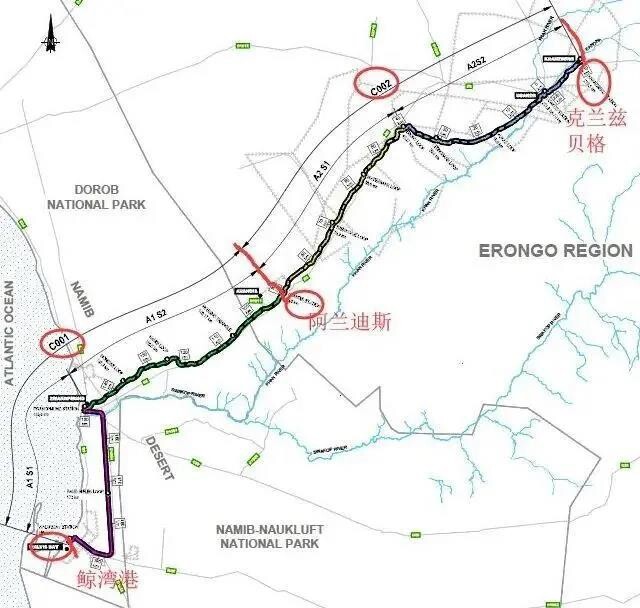 该项目C001标段(鲸湾港至阿兰蒂斯)位于纳米比亚西海岸,总长约107.5km。合同工期821天,合同金额9.8亿纳元(约7241万美元)。项目资金来源为纳米比亚政府自筹和非洲开发银行援助贷款,项目全线铺设米轨(轨距1065mm)。