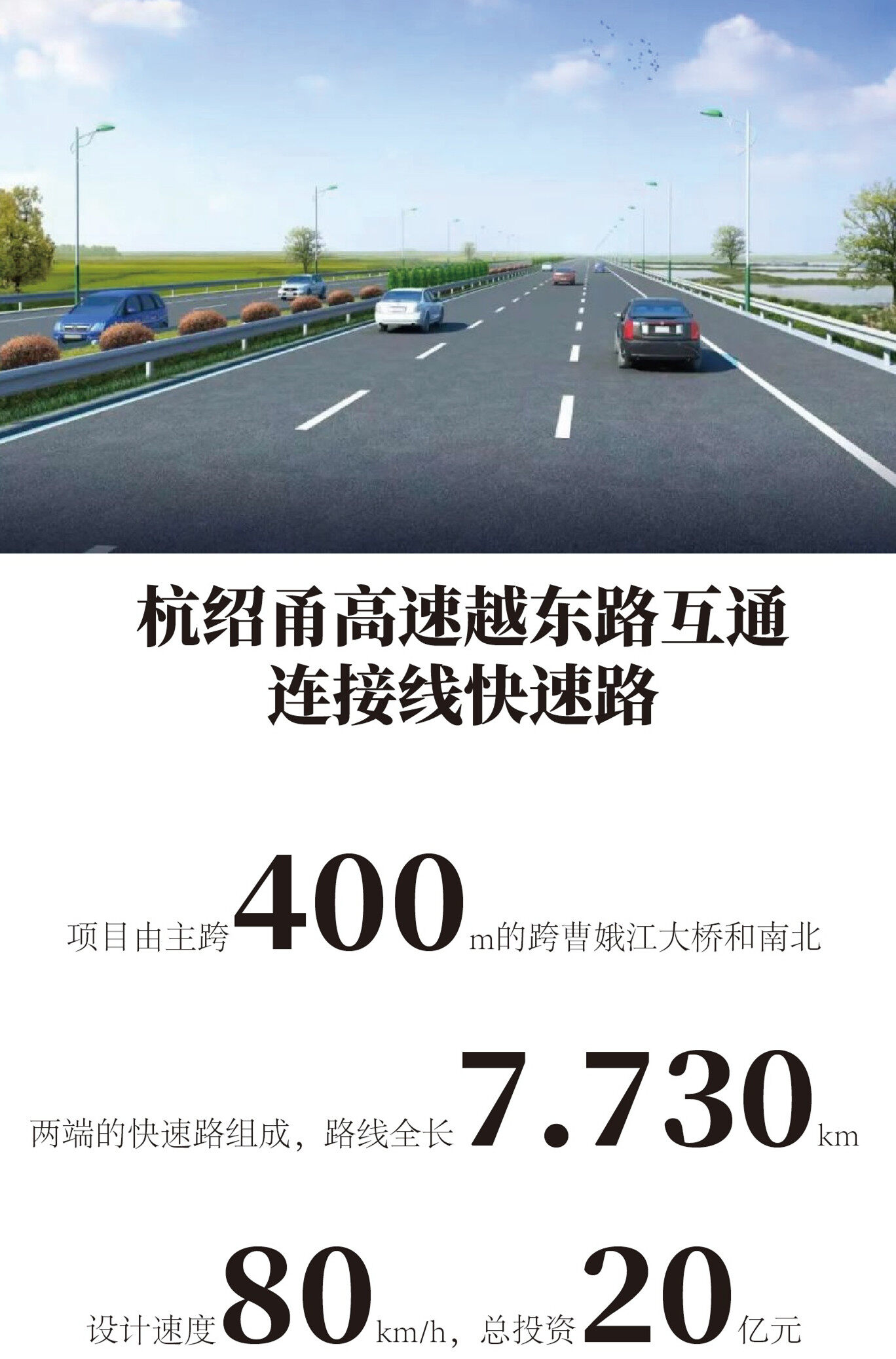 杭绍甬高速越东路互通连接线快速路项目由主跨400m的跨曹娥江大桥和南北两端的快速路组成,路线全长7.730km,采用双向六车道一级公路设计标准,设计速度80km/h,总投资20亿元。