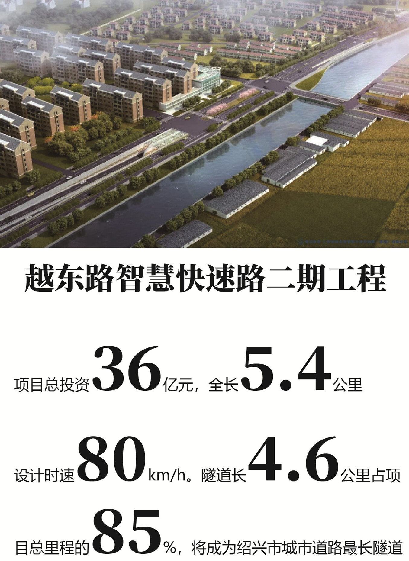 越东路智慧快速路二期工程项目总投资36亿元,全长5.4公里,设计时速80km/h。其中隧道长4.6公里,占项目总里程的85%,将成为绍兴市城市道路最长隧道。
