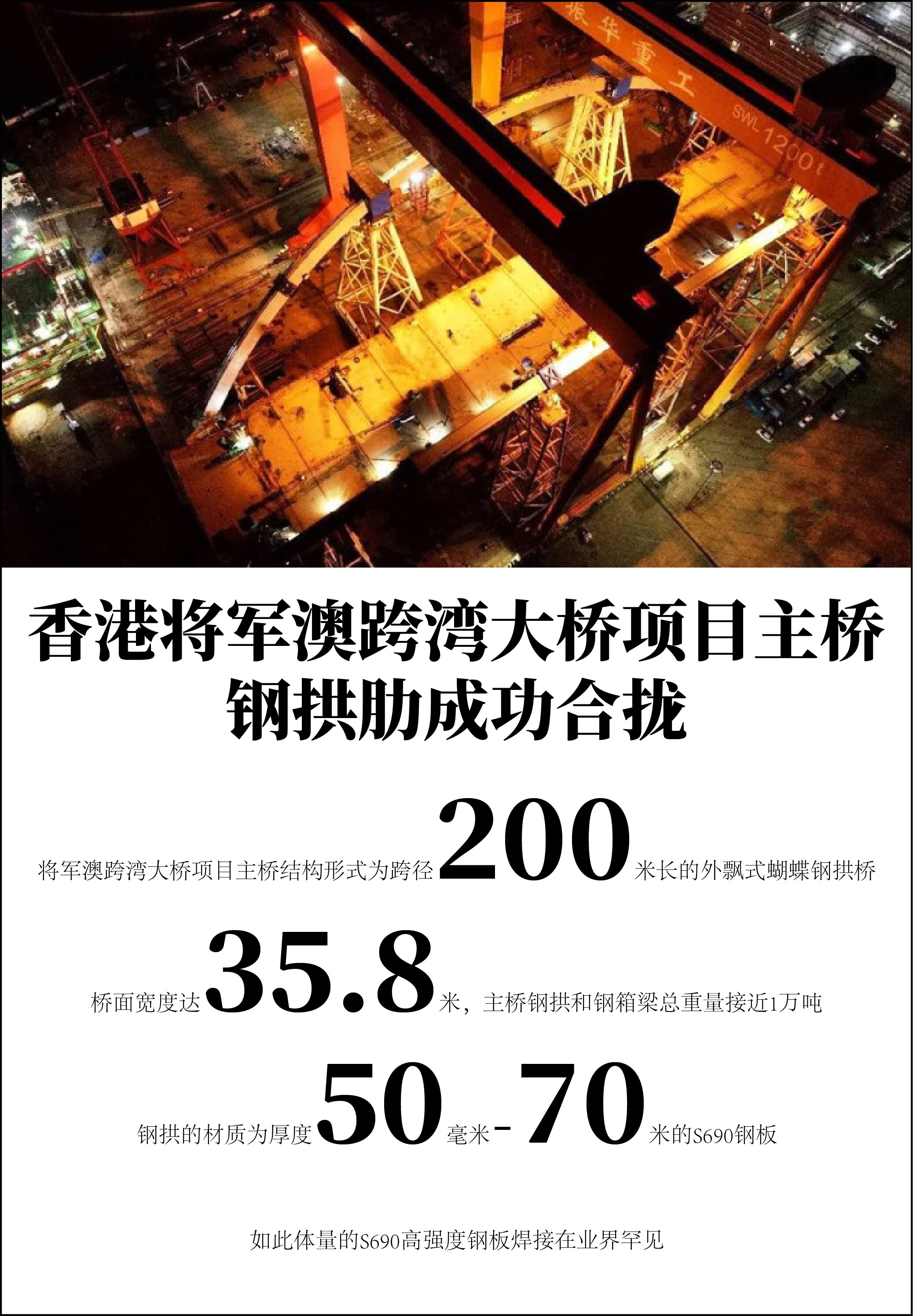 2020年11月28日晚上,香港将军澳跨湾大桥项目主桥最后一段钢拱肋大节段在两台1200吨龙门吊的配合下顺利合拢,这是项目继主桥钢箱梁合拢后又一个重要里程碑。